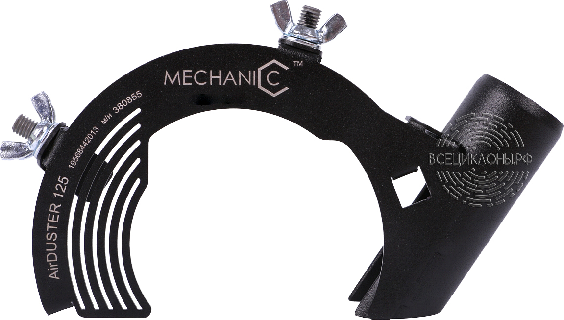 Кожух универсальный для размера 4-5″. То есть он формально подойдет для болгарок под круг 115-125 мм. Универсальность достигается за счет крепления. В корпусе вырезано три радиальных паза, в которых двигаются зацепы. Стягиваем продетый в них червячный хомут — зацепы притягиваются к месту крепления штатного кожуха на болгарке. Забыл замерить диаметр пылеотвода — он около 20-25 мм, мелковат немного, хотя и производительность 125 диска не настолько велика.