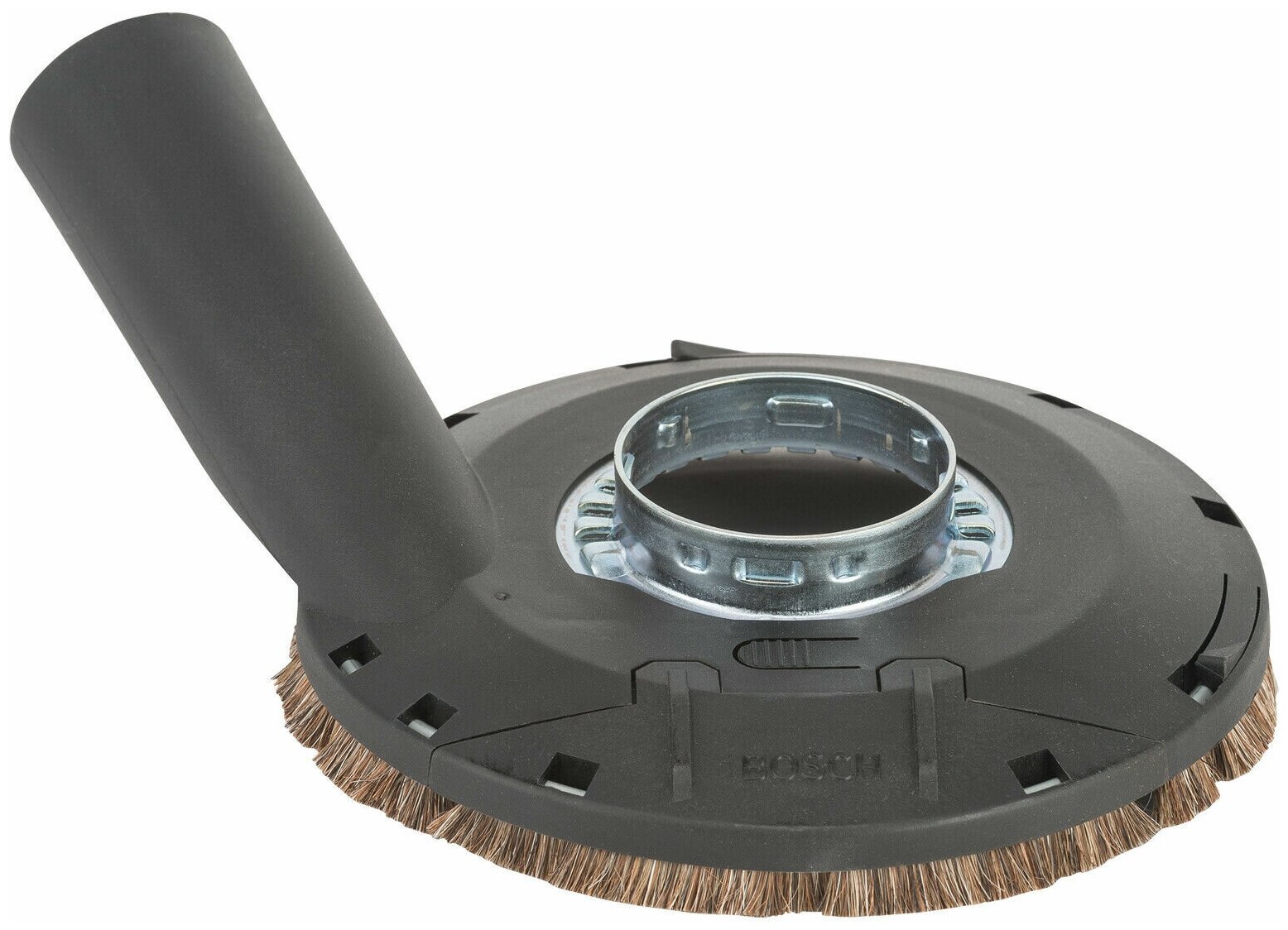Кожух универсальный для размера 4-5″. То есть он формально подойдет для болгарок под круг 115-125 мм. Универсальность достигается за счет крепления. В корпусе вырезано три радиальных паза, в которых двигаются зацепы. Стягиваем продетый в них червячный хомут — зацепы притягиваются к месту крепления штатного кожуха на болгарке.