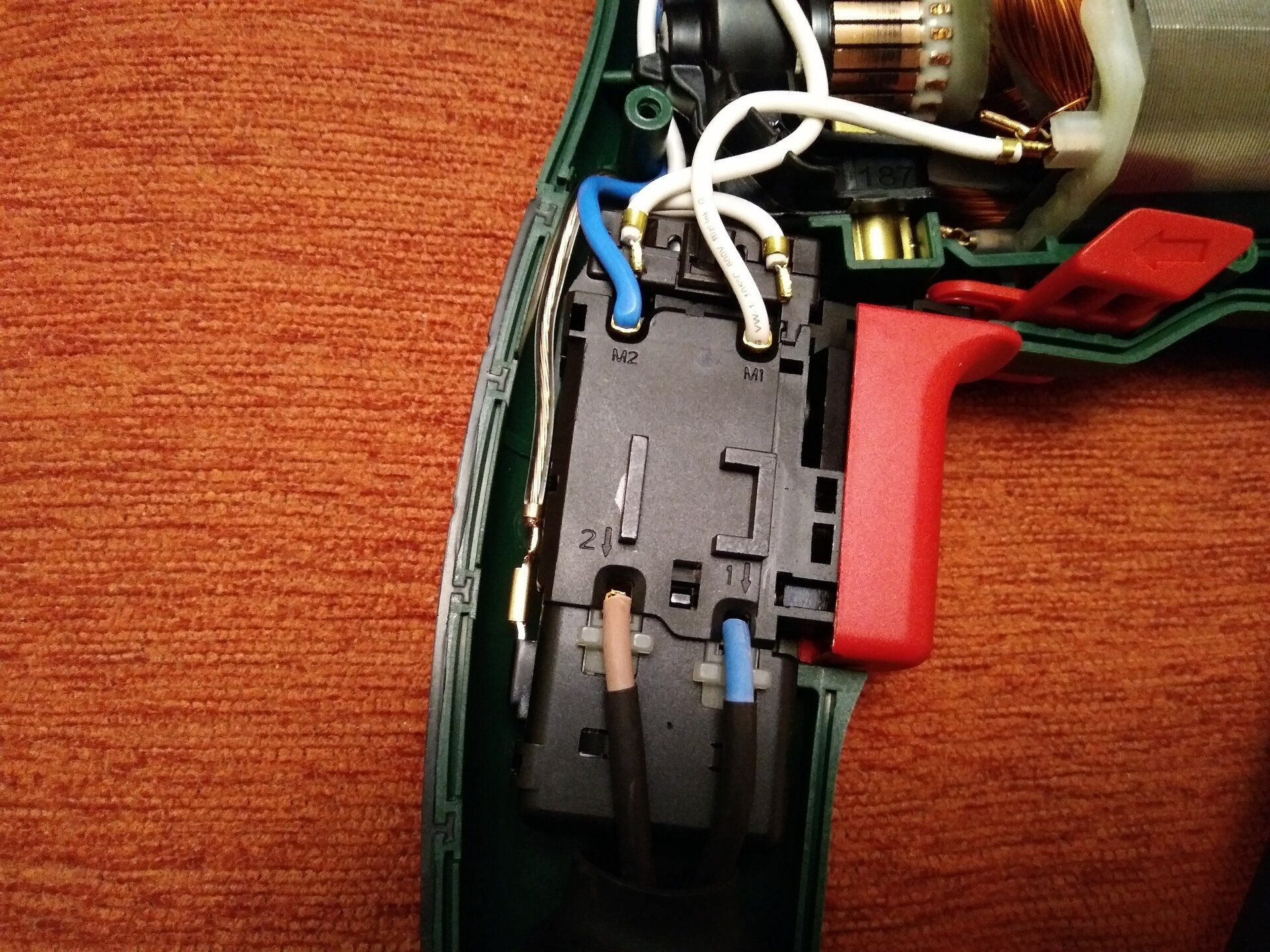 Выводы неподвижных контактов соединяем в соответствии со схемой и припаиваем к ним два провода, идущие к мягким проводам щеток. Провода, идущие к тумблеру, перед пайкой с одной стороны (тумблера или электродвигателя) заранее просовываем в резиновую втулку. Задачу осложнит то, что через нее уже проходит сетевой провод инструмента. Бывалые палачи советуют использовать в подобных случаях мыльный раствор.