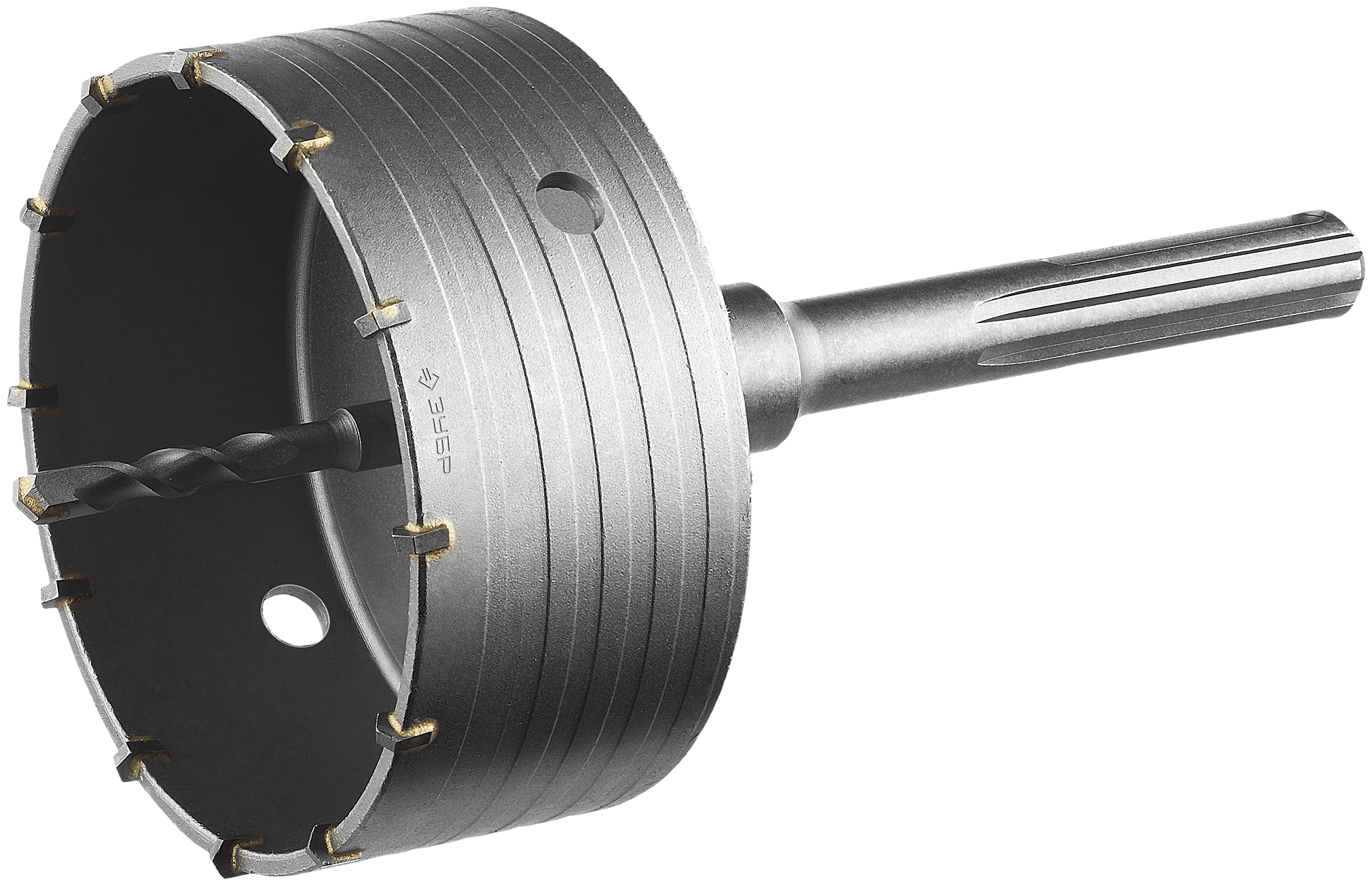 Зубчатые твердосплавные коронки эффективны в комплекте с перфоратором. В патронах перфораторов используется стандарт крепления SDS, предусматривающий наличие специальных фиксирующих пазов в хвостовиках сверлильного инструмента.