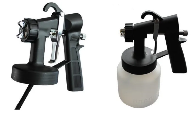 Электрические краскопульты в основном изготавливаются из пластика или металла. Плюсом металлического бачка для ЛКМ является легкость в его отмывании, а минусом – его непрозрачность, что не позволяет оценить остатки краски, находящейся в нем.