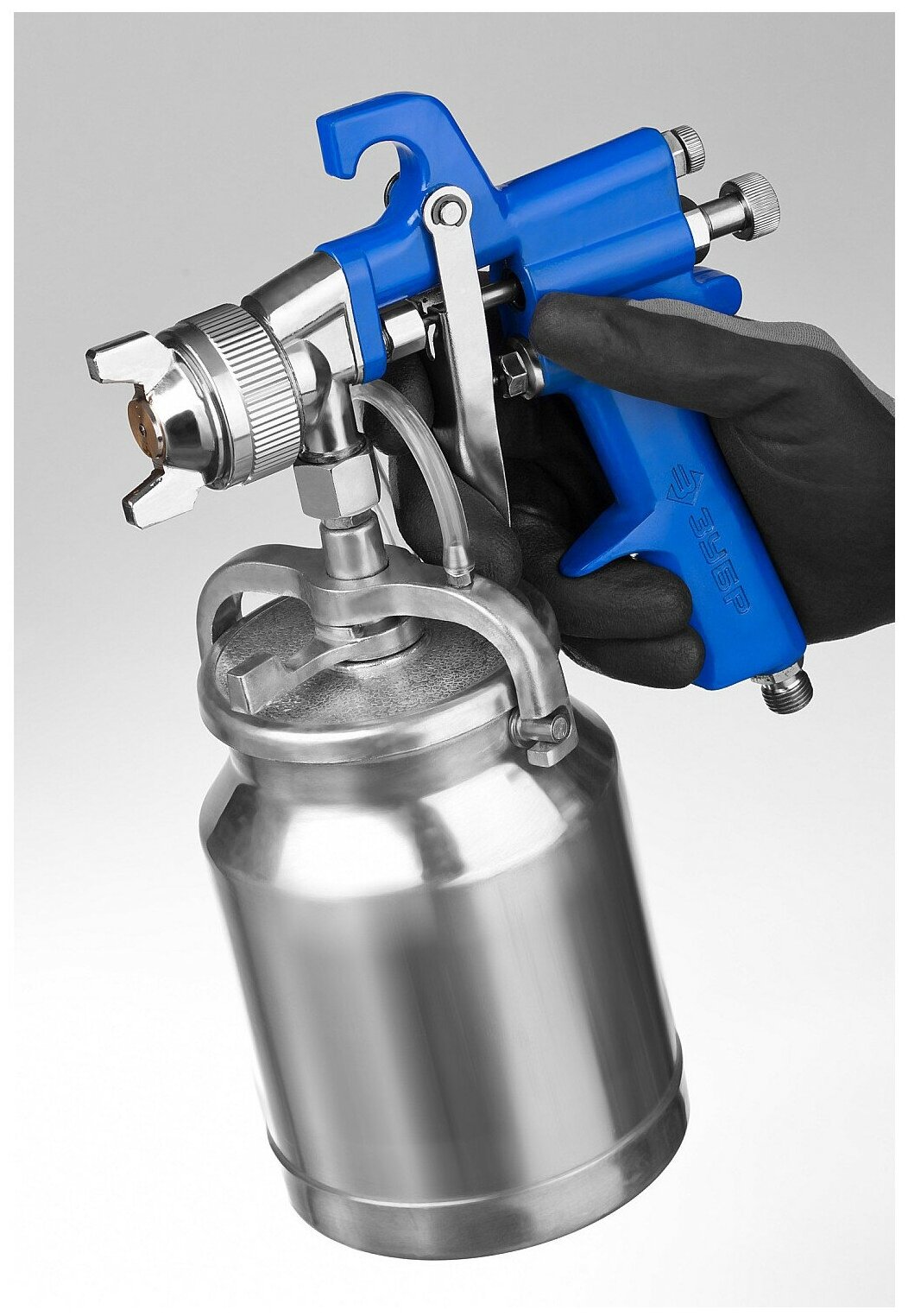 Какой будет бачок верхний или нижний решает сам мастер. Здесь важно удобство для него. Когда он внизу обзор не закрывается, когда наверху, краска полностью используется.