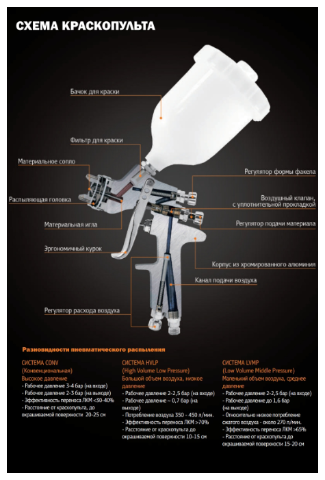 Регулятор размера факелаВинтовой элемент, изменяющий положение стержня с конусообразным наконечником, напоминающий толстое шило. Регулирует напор воздуха идущий в голову инструмента, путем приближения или отдаления стержня от пропускного отверстия. Чем дальше от сопла располагается наконечник, тем более сильный напор воздуха попадает в голову, создавая факел больших размеров. Приближение стержня, наоборот, ограничивает поток, уменьшая его влияние на формирование факела. Максимальный размер факела, представляет собой вытянутый овал, а минимальный, превращает его в точку.Подача материалаПеретекание краски из бачка в сопло перекрывает специальная игла, чей конусообразный наконечник, плотно прилегает к внутренним стенкам сопла.