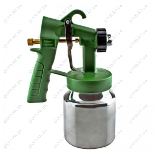 Работает на сжатом воздухе. Нагнетание воздуха в красящий пистолет производится вручную, при помощи поршневого насоса.