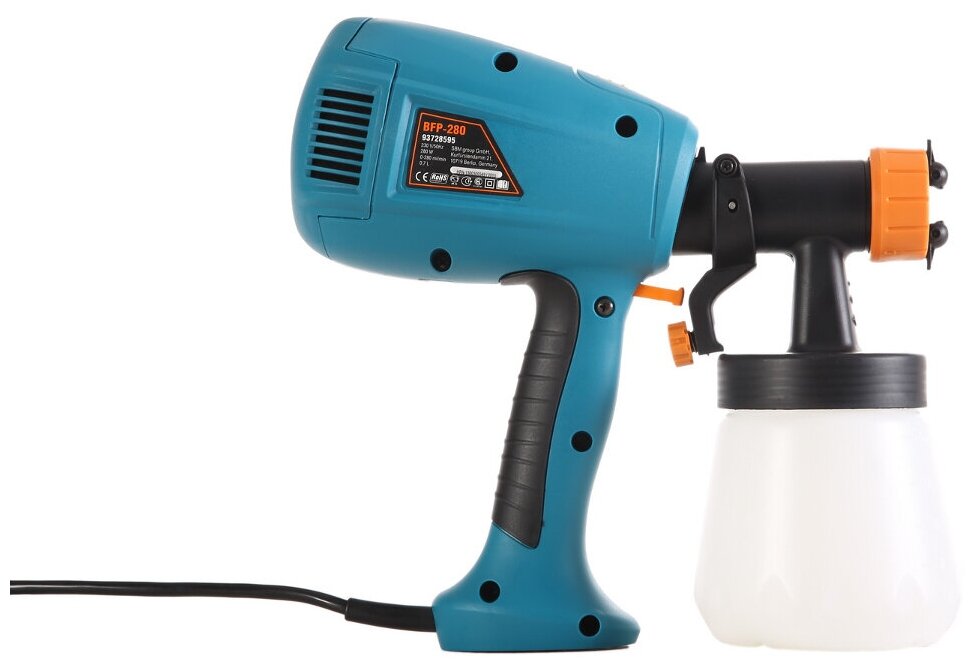 Электрический краскопульт HAMMER PRZ150A эксперты характеризуют, как производительный аппарат. Он удобен в работе, позволяя эффективно распылять грунтовки, краски, лаки, эмали и другие материалы. Модель стала победителем нашего рейтинга за счет сочетания доступной цены и хороших технических параметров. В инструменте предусмотрена регулировка факела распыла в трех положениях, а также возможность корректировки по горизонтали и вертикали. Благодаря этому удается экономно распылять ЛКМ, снижая расход краски до 40 %.