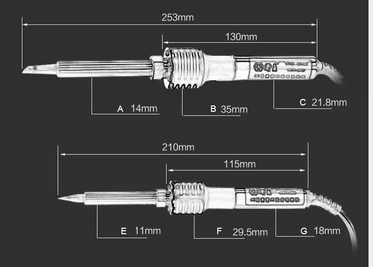 - Электрический паяльник переменного тока со спиральным разогревом сердечника работает от стандартной сети электропитания для бытового оборудования в 220В 50-60Гц.