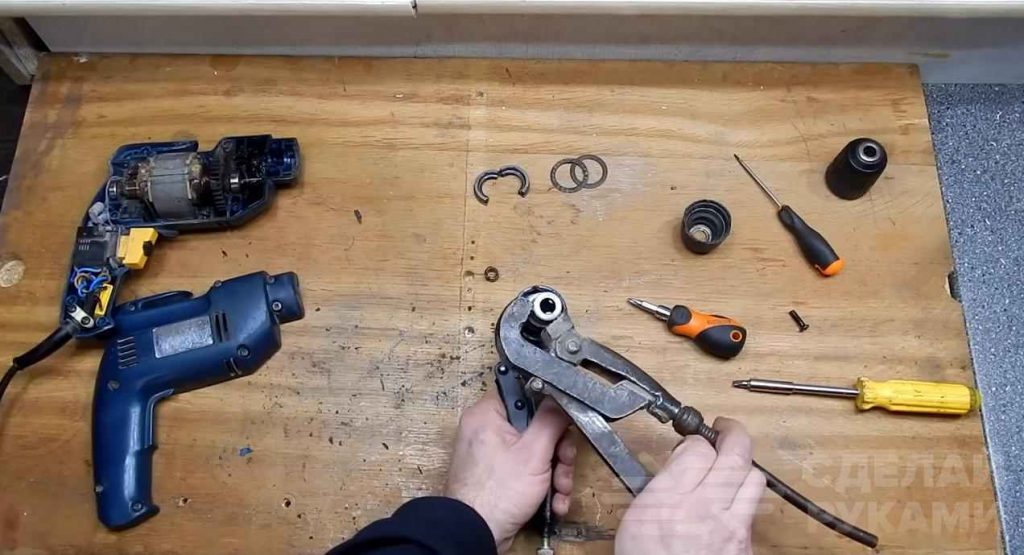 - Хвостовик инструмента расклепался. Потребуется сначала залить жидкость WD-40 и попробовать вытащить бур. Если ничего не получается, то нужно разобрать патрон и выбить оснастку.