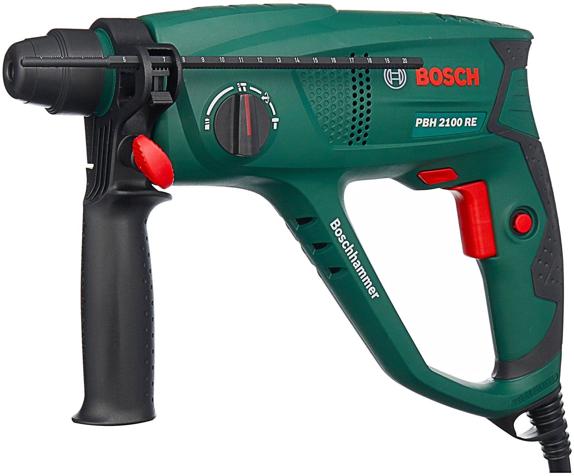 Перфоратор Bosch GBH 2-26 DFR с горизонтальным расположением двигателя. Под ним: сменный кулачковый быстрозажимной патрон, бур, ограничитель глубины сверления Перфоратор OMAX 04602 с вертикальным расположением двигателя.
