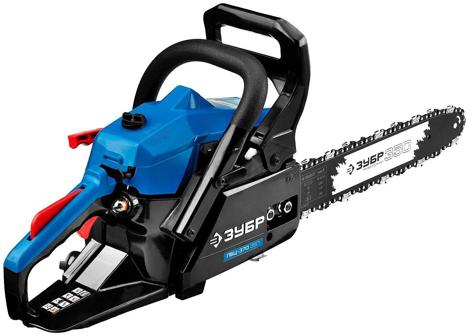 - Тормоз цепи защищает пользователя от обратного удара — при рывке пилы вверх, рычаг тормоза упрется в руку рабочего, автоматически активировав стопор.