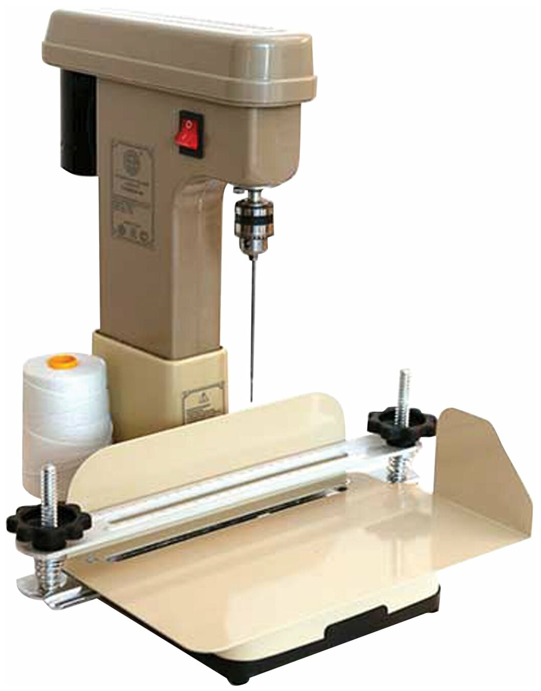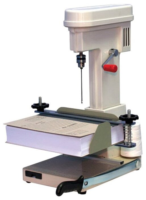 Sömnad utförs på ett godtyckligt antal hål längs ryggraden (rekommenderas för 3 eller 4 hål), indraget from kanten ställs in manuellt (justerbart).Enheten genomborrar en pappersstråle och drar ut tråden (bildar en ögla), седан trådas trådarna от экстремумов hålen i de formade öglorna och dras samman med en vanlig knut. Utrustad med en fram- och återgående papperskärare.