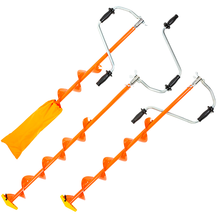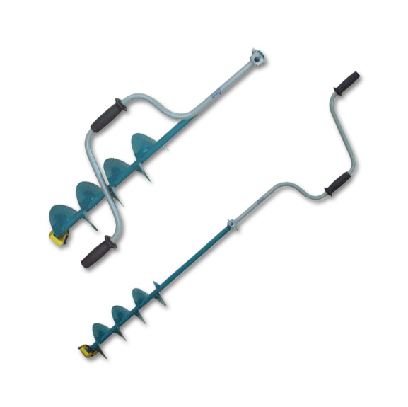 Такие ледобуры стоят в разы дешевле, кроме того, они компактнее и эргономичнее своих собратьев. Ручные буры бывают одноручными либо двуручными. В первом случае рукоятка размещается по единой оси со шнеком, поэтому вращение передается лишь за счет действия правой руки, которая фиксирует нижнюю рукоятку. А вот в двуручных модификациях рукоятки размещены по обе стороны оси. Здесь вращение происходит как результат движения обеих рук – в этом случае процесс существенно упрощается и требует гораздо меньше усилий.