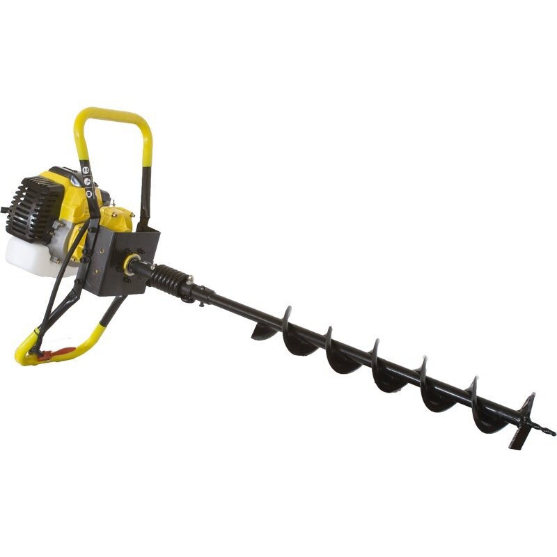 Главный элемент конструкции – шнековый бур, в нижней части которого находится пусковой наконечник и нож, переходящий в спиральный шнек. Вращаться и углубляться в землю он начинает при помощи двигателя (обычно двухтактного). При этом отработанный грунт автоматически извлекается на поверхность.