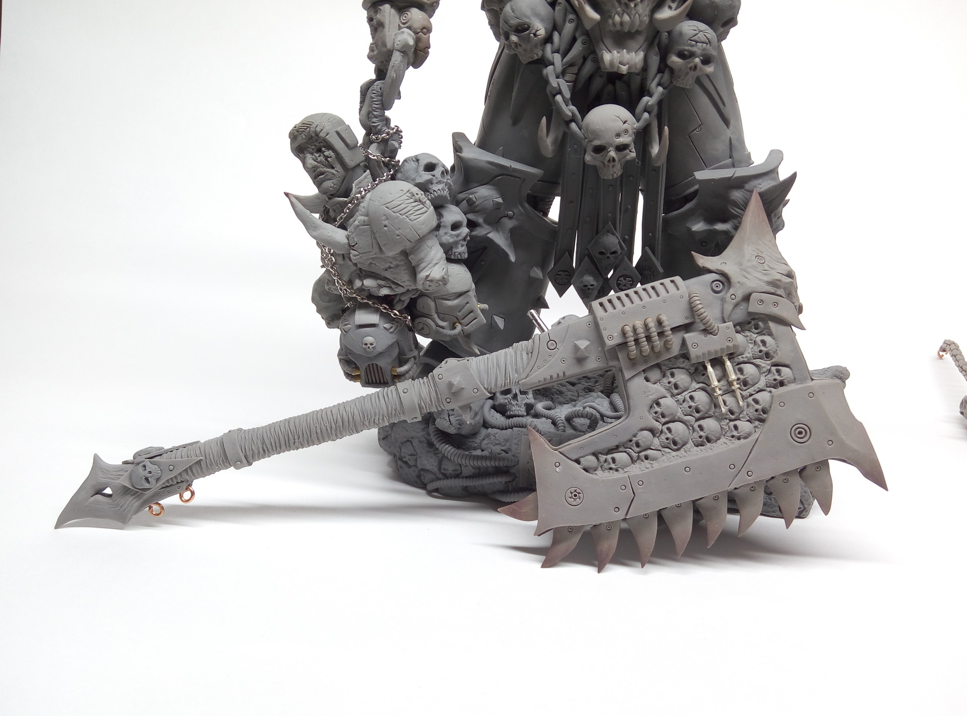 Зубы его цепного лезвия происходят из пасти слюдяных драконов Мира Смерти Лютера Макинтайра IX, его рукоять выкована из Адамантия, а его голова имеет полные три пролета в поперечнике. Первоначально его использовал в бою Ангрон с двойным отцом Gorefather , но теперь он используется только как одиночное оружие Кхарном Предателем, Чемпионом Кхорна среди Пожирателей Миров.