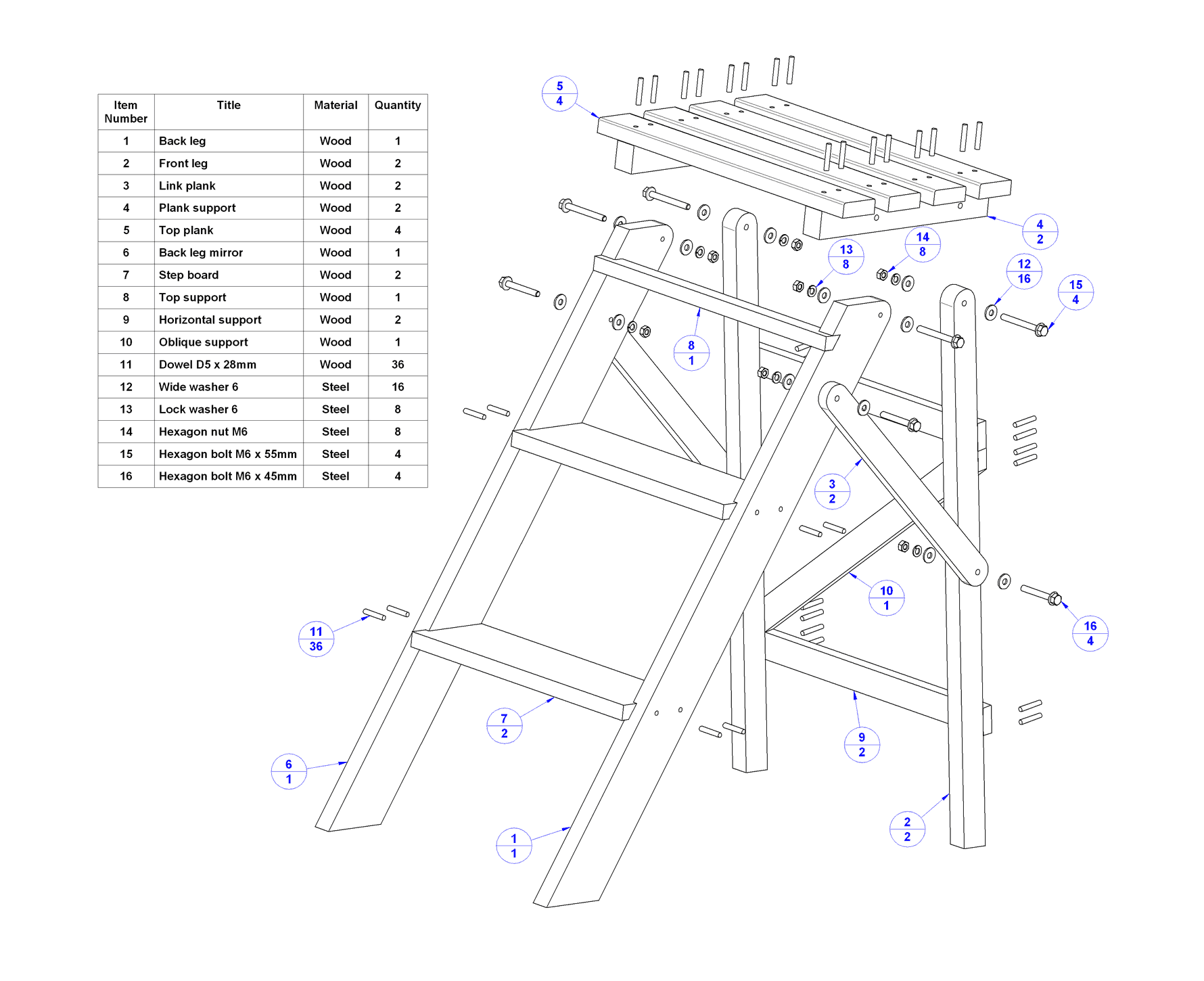 Поэтапная сборка стремянки своими руками, малогабаритная стремянка, чертеж
