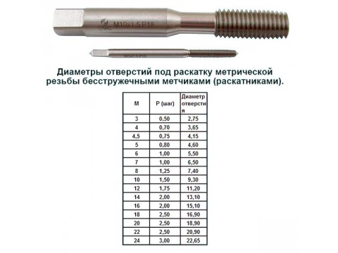 Каждый метчик в комплекте на хвостовой части имеет одну, две и три риски. В соответствующем порядке их используют при нарезании резьбы. Диаметр сверла для сверления отверстий под нарезание внутренних метрической и трубной резьб выбирают по табл. 7 и 8.