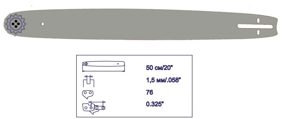 Длина пильного полотна определяет максимальную глубину погружения в материал и допустимый размер цепи, которую можно на него установить. По стандарту, значения выражаются в дюймах и указываются на самой детали (в районе хвостовика), вместе с рекомендуемым количеством звеньев. Стандарты разнятся в зависимости от шага ведомой звездочки. Данные, по самым распространенным разновидностям, приведены в следующей таблице.