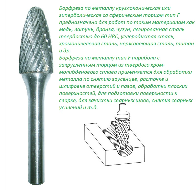 Это некий компромисс между цилиндром и сферой. Сохраняя универсальность при обработке точечных зон, шарошка по металлу овальной формы уже может зачистить торцевую сторону заготовки.