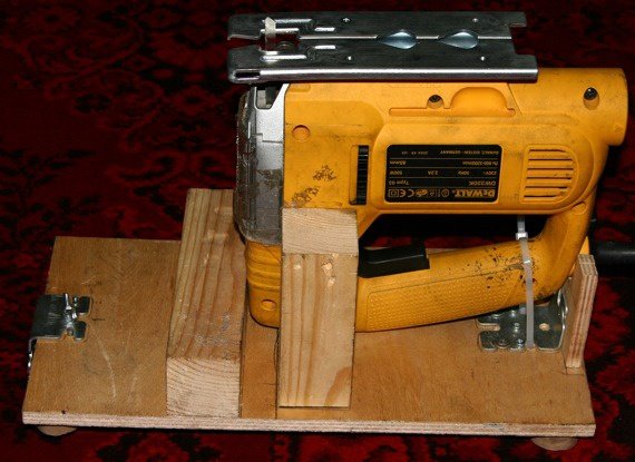 Держателям ручного лобзика повезло больше. Из листа фанеры можно сделать подставку и прикрепить к ней лобзик. Чтобы закрепить лобзик своими руками, придется проделать отверстия в основании инструмента. Самая простая модель готова.