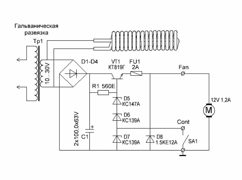 - Модуль управления. Этот блок оснащается микросхемой для регулирования температуры и понижающим трансформатором. Именно благодаря этому модулю пользователь может самостоятельно выбрать температуру нагрева.