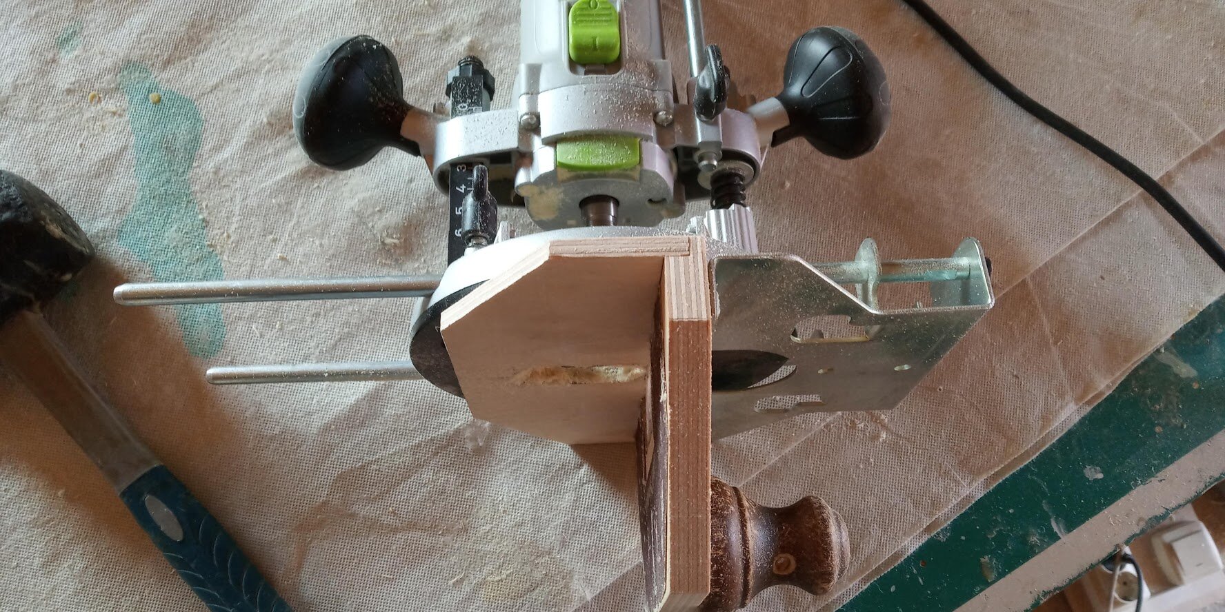 В данном приспособлении глубину резания настраиваю, изменяя вылет хвостовика фрезы |из патрона дрели. При необходимости можно увеличить диапазон регулировки за счет высоты ножек.