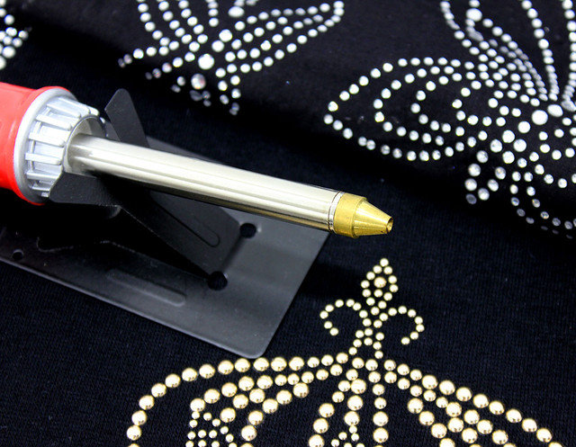 Паяльник для стразНекоторые материалы нельзя гладить, поэтому приклеить стразы с помощью утюга к такой одежде не получится. В этом случае можно воспользоваться аппликатором. Он незаменим, когда нужно украсить кристаллами замшевую, кожаную или бархатную материю. В комплекте с паяльником всегда продаются насадки разных размеров, которые позволяют прогревать и приклеивать как большие, так и очень мелкие детали.