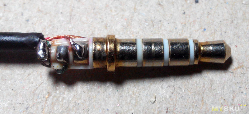 Определяемся какие провода скручиватьПроводков в гарнитуре явно побольше чем три — их пять. Два провода отвечают за микрофон, и три за наушники. Разлохмаченный золотой провод(земля) был накручен поверх тонкого белого — микрофонного.