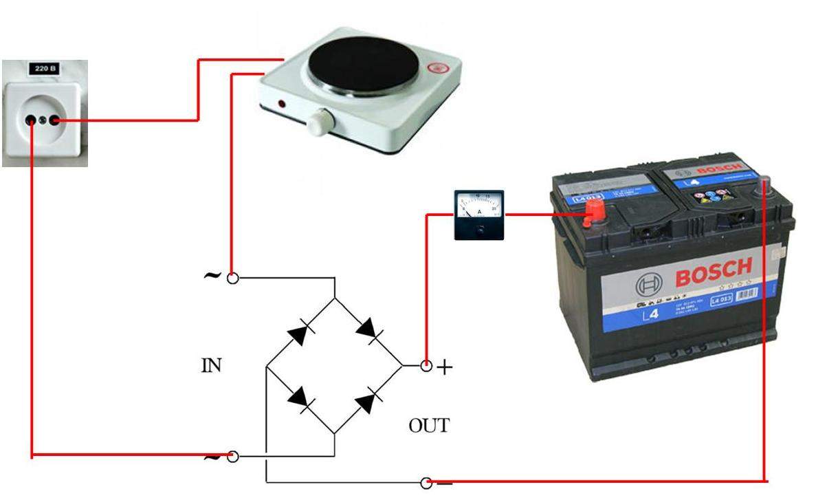 Чтобы проверить диодный мост, нужно подать напряжение на зарядное устройство. Если элемент исправен, то ток будет присутствовать как на входе в диодный мост, так и на выходе из него. Если это не так, то проверяется каждый диод моста. Нормальная работа диода характеризуется небольшим сопротивлением с одной стороны и почти бесконечным с другой.