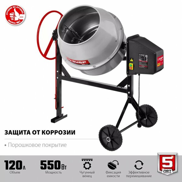 Большая, но портативная бетономешалка от Ozito, 120 литровая мощность 550 Вт (модель CMX-120) – отличное вложение для домашнего использования или торговли. Мотор мощный 0.7HP и может справиться со всем: от бетона до почвы, кормов для животных, удобрений и т. Д. С легкостью справьтесь со всеми более тяжелыми работами, такими как подпорные стены и бетонные плиты, вплоть до мульчирования грядок.