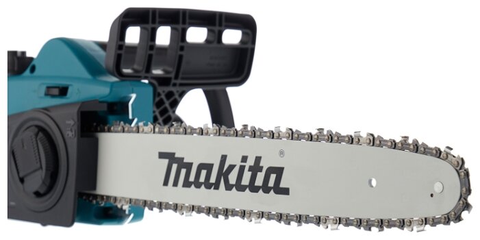 На электрической пиле Makita регулятор натяжки выполнен таким образом, что его можно проворачивать без применения какого-либо инструмента. Вращая его по часовой стрелке, вы будете натягивать цепь, если вращать регулятор в противоположном направлении, натяжение цепного элемента будет ослабевать.
