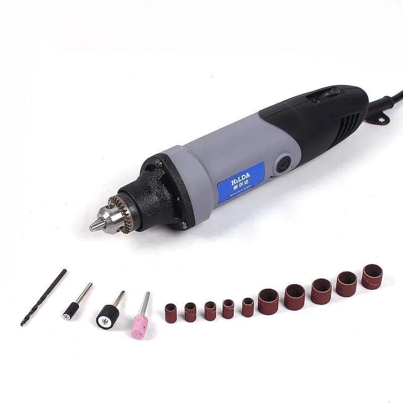 Этот электрический прибор прячет в своём корпусе двигатель и вращающийся патрон. Присоединяя к нему различные насадки, мастер может выполнять разные виды работ за счет вращающейся с разной скоростью оснастки. Таким образом можно обработать металл, драгоценные камни, стекло и другие материалы.