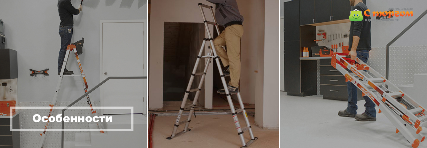 Удобно и практично, но имейте в виду, что стоить такая лестница будет дороже, чем аналог той же высоты, но без телескопических ножек, да и весить она также будет больше. Всему виной – более сложная конструкция; - лестница-трансформер отличается сложной конструкцией на шарнирах, благодаря чему может использоваться как обычная приставная лестница, классическая стремянка или подмости. Высота при этом также, как правило, регулируется.