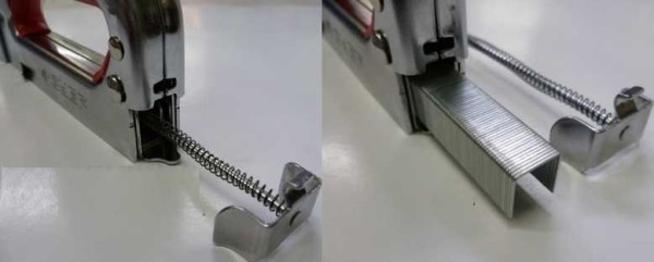 Магазин строительного степлера может быть двух видов. Инструментом удобнее пользоваться в том случае, когда магазин открывается. Тогда вставить скобы в строительный степлер так же просто, как и в канцелярский: