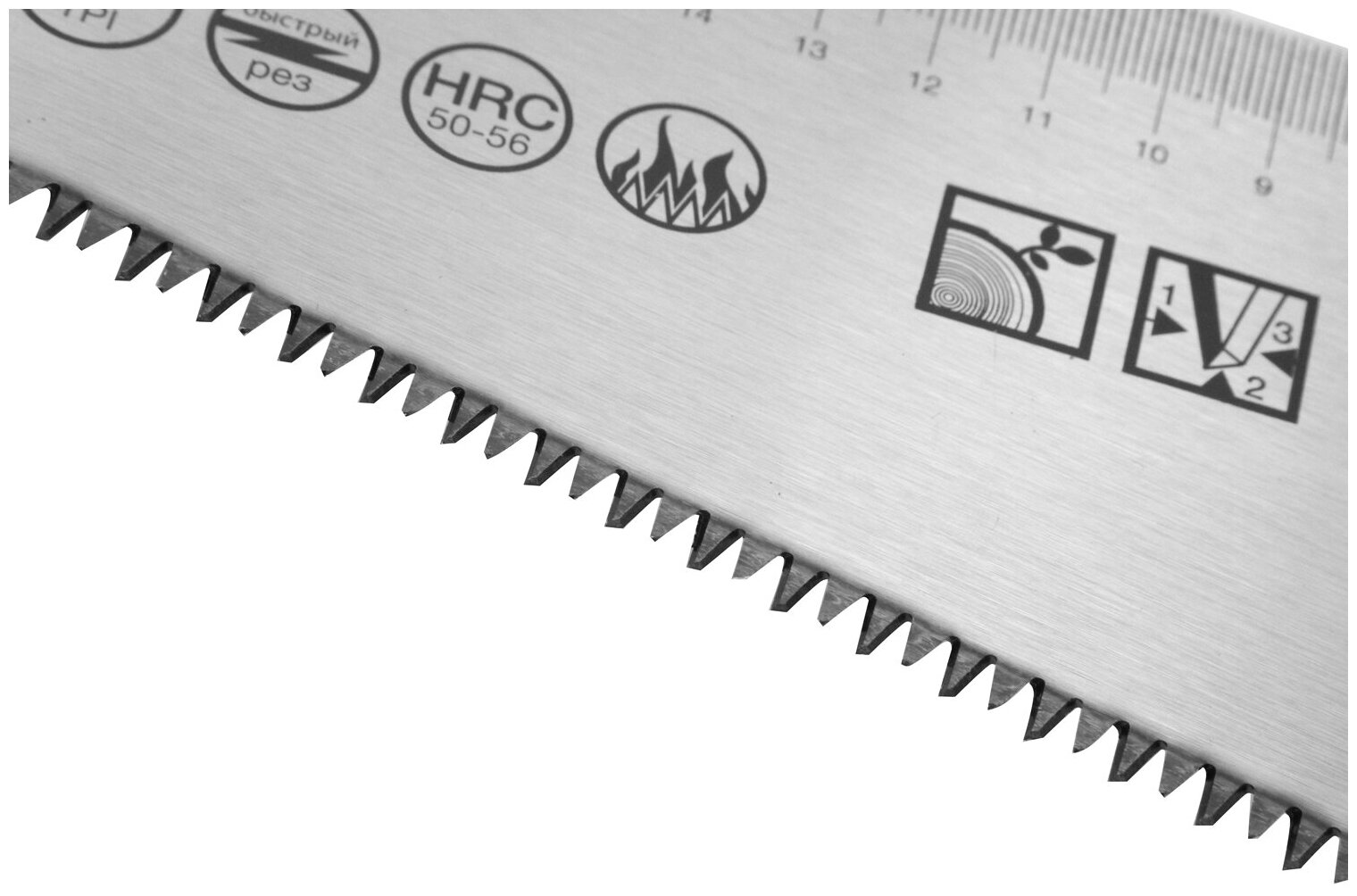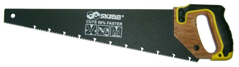 Чтобы работа с инструментом была легкой, прежде чем покупать ножовку, обратите внимание на рукоять. Она может быть деревянная или пластиковая, но наиболее удобной является двухкомпонентная рукоять с резиновой вставкой. Она обеспечивает надежный хват, не дает руке скользить и не натирает ладонь. Даже работая продолжительное время, Вы не ощутите большой нагрузки на кисть руки. Если Вы покупаете ножовку для плотницких работ, то обратите внимание на модели, у которых на полотне имеется шкала делений, как на линейке. Можно делать разметку, не отрываясь от рабочего процесса и используя один инструмент.