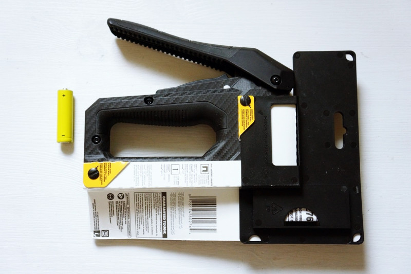 Инструмент производится в Китае под известным брендом Bosch. За один удар степлер вгоняет в поверхность одновременно две скобы. В зависимости от твердости материалов оператор имеет возможность настраивать мощность удара (электронная предустановка).