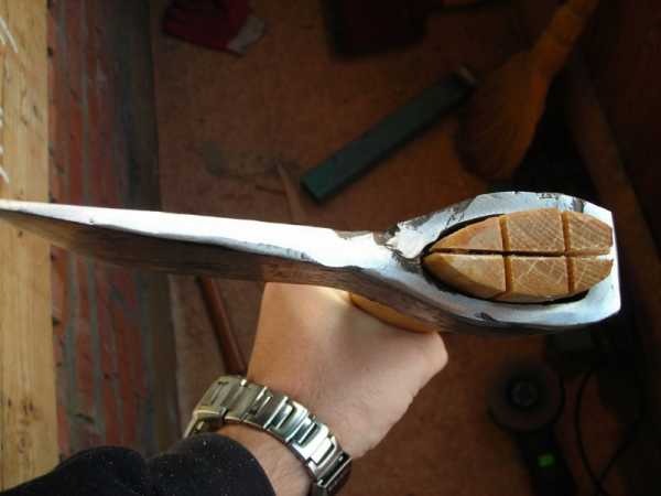 Когда обе части инструмента готовы, остается только их соединить. Для этого обычно используют эпоксидную смолу и отрез обычной марли или медицинского бинта. Для дополнительной фиксации металлической головы на топорище, забиваются деревянные клинышки.