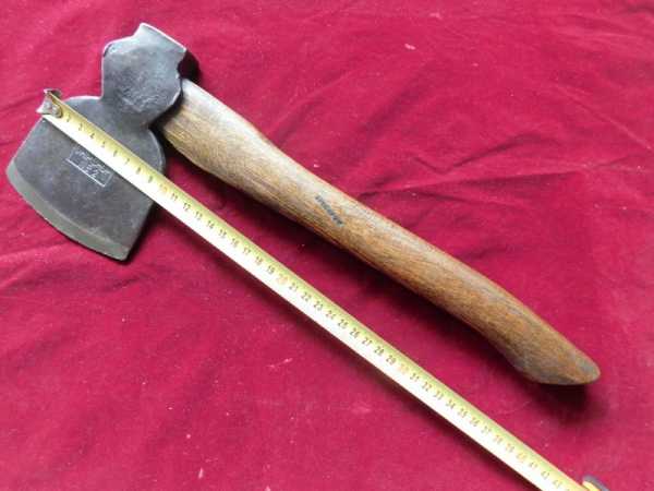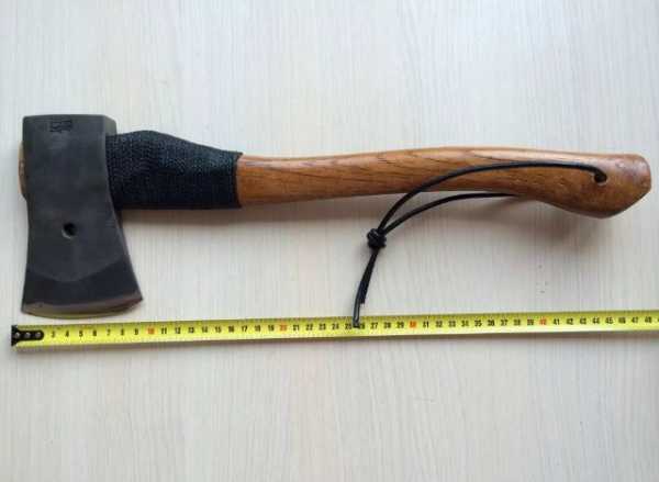 Топорище у охотничьего топора должно быть не меньше 50смПри соединении двух частей инструмента необходимо учитывать, что угол наклона между ними должен составлять не привычные 90 градусов, а меньший показатель. Примерно ориентироваться можно на 65-75 градусов. И еще один немаловажный критерий заключается в том, чтобы топорище при его длине обладало максимально легким весом. В противном случае, руки быстро устанут работать с топором.
