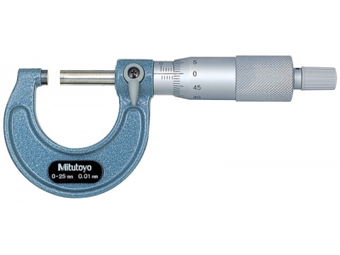 Самый распространенный тип – наружный микрометр. Корпус микрометра имеет форму подковы. Некоторые микрометры на корпусе имеют пластиковые подушечки для пальцев, чтобы предотвратить передачу тепла металлическому корпусу, что может привести к небольшому расширению металла и повлиять на показания. На одном конце рамы находится наковальня, которая касается одной стороны измеряемой детали. Второй контактной точкой измерения является подвижный шпиндель. Микрометр измеряет расстояние между наковальней и шпинделем так, чтобы оно соответствовало расстоянию измерительной части.