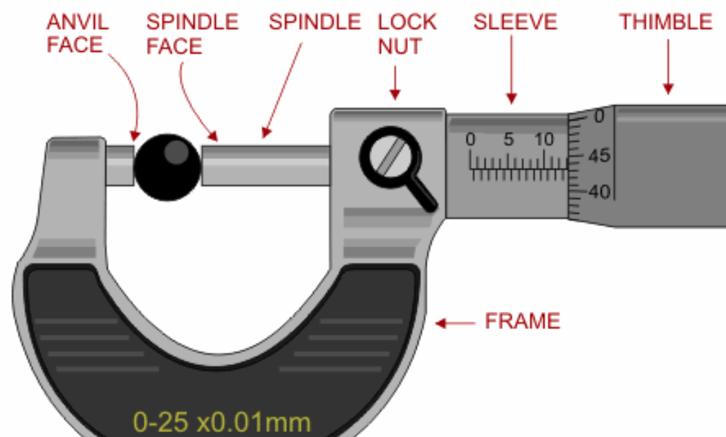 Чтобы понять, как работает микрометр, сначала следует рассмотреть основные компоненты инструмента. Анализ компонентов также должен способствовать вашему пониманию того, как читать показания микрометра.