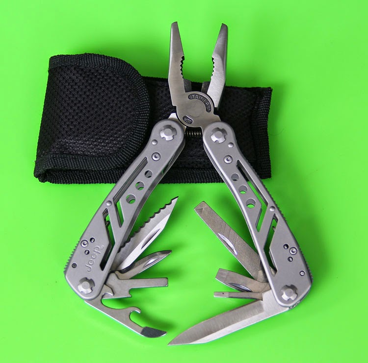 Он имеет всего семь функций: плоскогубцы с пружинным механизмом, разводной ключ, кусачки, две отвертки, острый нож, рукоятку с гнездом и девять отверток, которые хранятся в футляре.