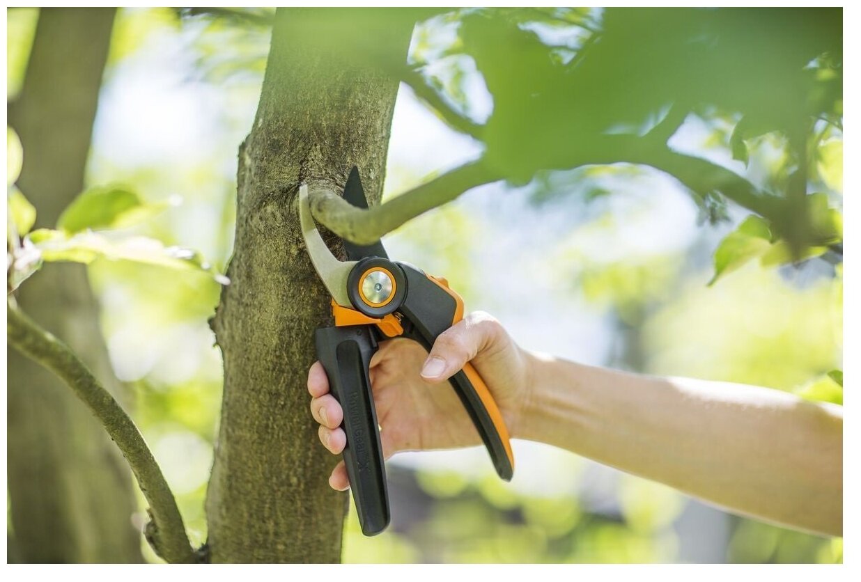 - Малый контактный сучкорез Fiskars с силовым приводом PowerGear – что-то среднее между секатором и большим сучкорезом. Для веток до 3,5 см в диаметре. Специальный силовой привод облегчает резку крупных веток