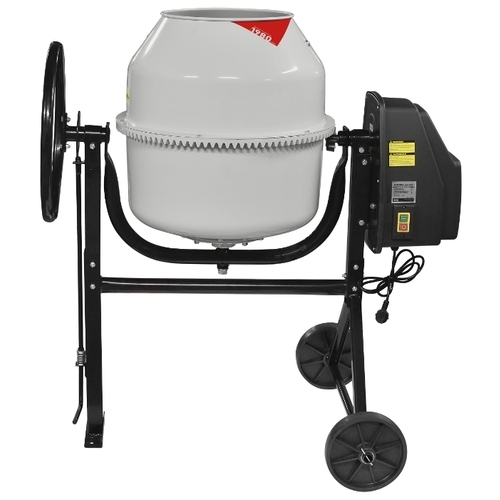 Барабан имеет две оси: одна, вокруг которой вращается барабан, и другая, которая служит для переключения из положения загрузки и смешивания (барабан открывается вверх) в положение разгрузки (барабан открывается вниз). Это изменение положения осуществляется вручную с помощью опрокидывающего колеса (или рукоятки в меньших миксерах), при этом барабан вращается на электрическом, бензиновом или дизельном топливе. Барабаны традиционно изготавливаются из стали, но теперь предлагаются бочки из полиэтилена для облегчения очистки. Большинство смесителей относятся к типу с боковой разгрузкой, но также производятся смесители с боковой разгрузкой.Материал обычно загружается вручную прямо в барабан. Бывают крупногабаритные самозагрузочные агрегаты с откидным бункером. После заполнения вручную на уровне земли бункер механически поднимается вверх и сбрасывает материал в барабан. Встроенный механический ковш для облегчения загрузки заполнителя в бункер не является обязательным для некоторых моделей.