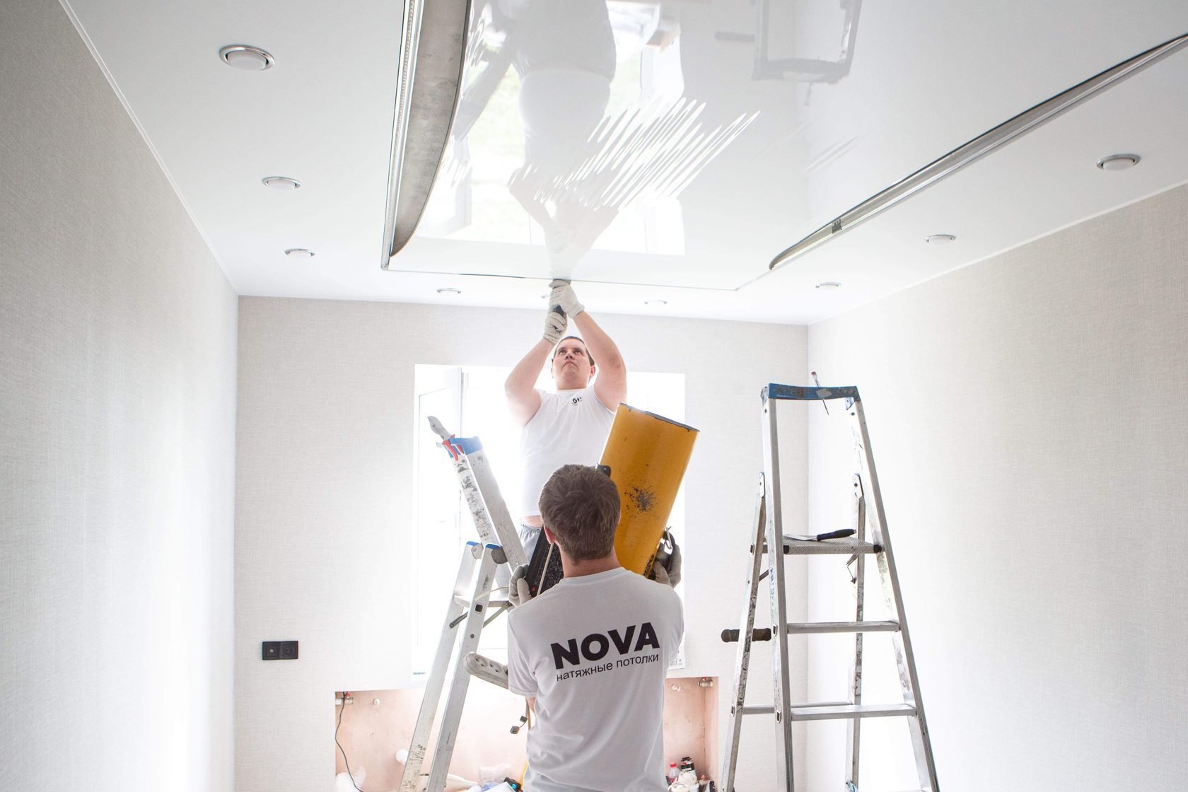 В процессе работы нужно будет оборудование для натяжных потолков и инструменты.