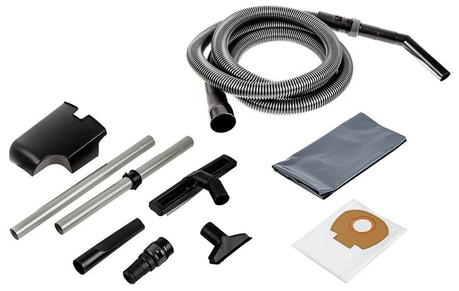 Вес прибора составляет 8,3 кг, объём рабочего бака, куда вставляется съёмный мешок – 25 л, разрежение (всасывание) – 210 МБар. Длина всасывающего шланга достигает 3,5 м.