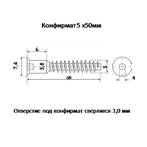 Конфирматы – это специальные винты, которые оснащены потайной головкой, в которой есть два типа шлицов. За счет наличия таких шлицев еврошурупы можно закручивать и четырехгранной, и шестигранной отверткой. Стержень этого винта оснащен тупым концом, а на рабочую часть нанесена сильно выступающая резьба.