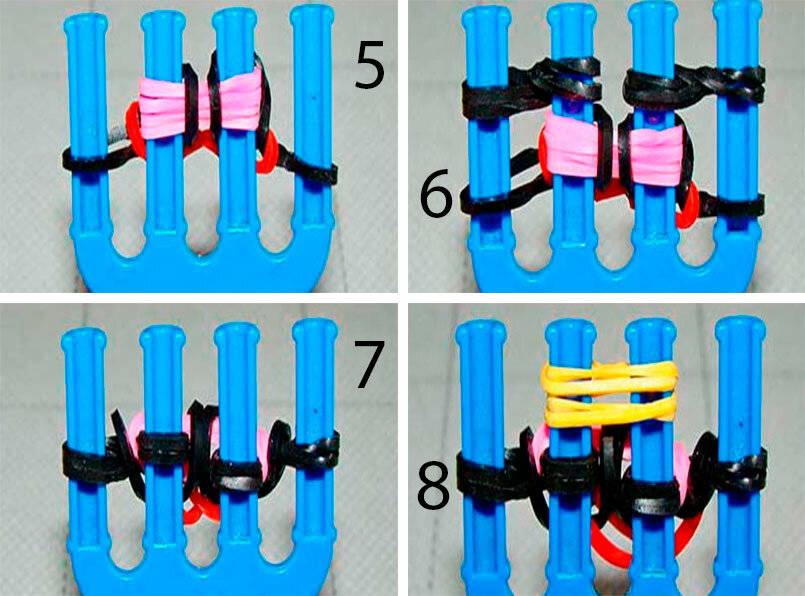 - В верхнем ряду станка надевают на три столбика одно белое колечко. В нижнем на крайние надевают по одной в четыре оборота. Далее с левой и правой стороны накидываются по одной паре белых колечек. Крючком снимают элементы в четыре оборота и верхнюю горизонтальную резинку и располагают посередине.