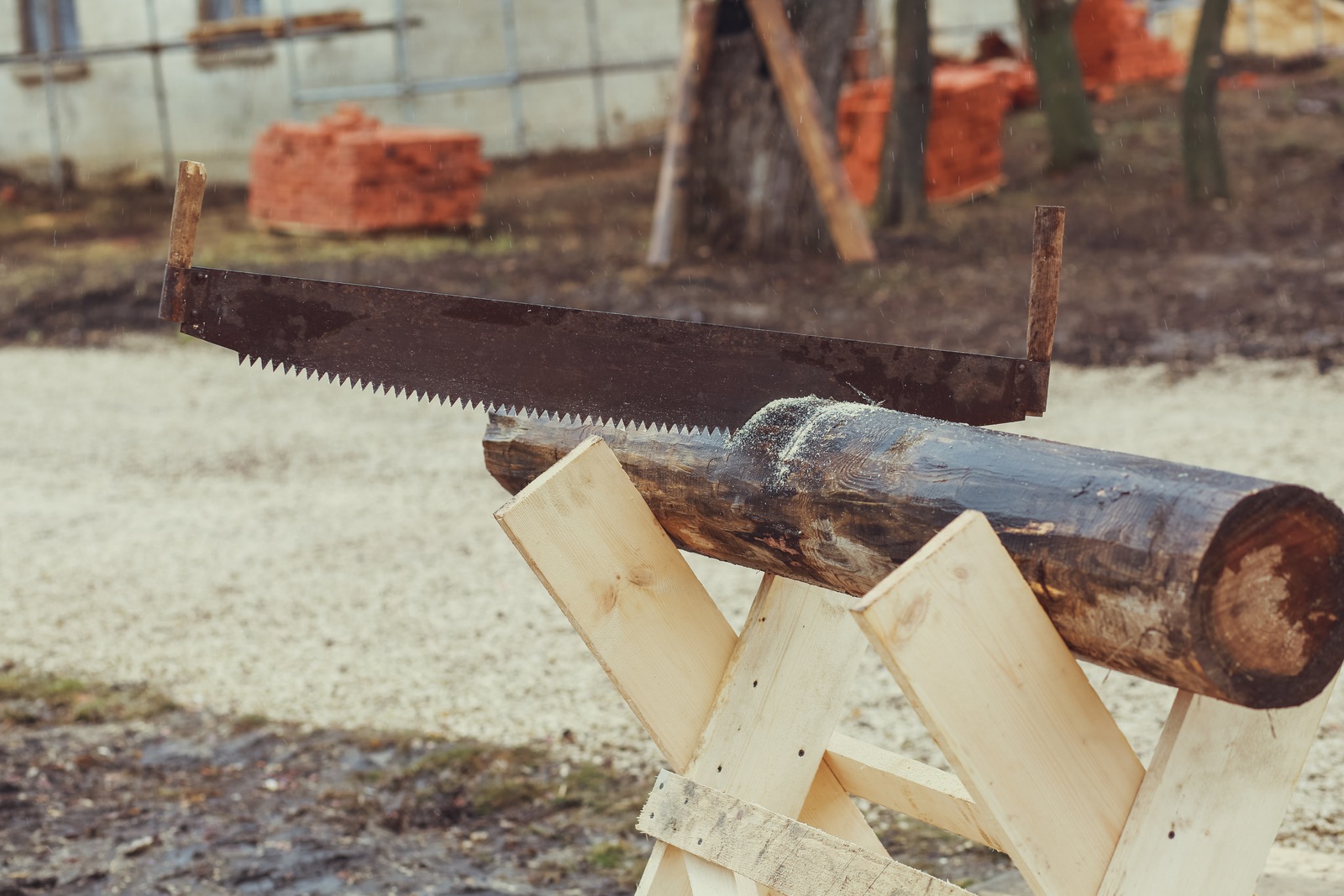 - Уложите бревно на козлы.