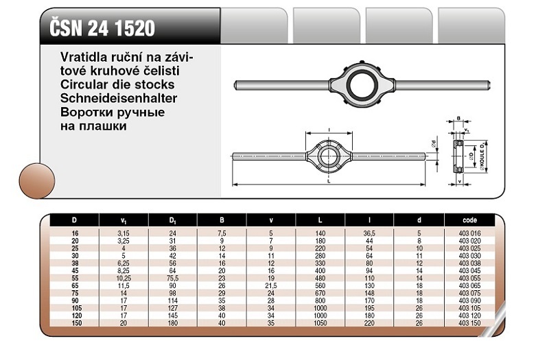 Размеры квадратов Для метчиков Общая длина воротка мм 013 953 Размер Размеры квадратов мм Для метчиков Общая длина воротка мм 013 953 0 2,1 – 2,7 – 3 – 3,4 М 1 -4 200 007 4 5,5 – 6,2 – 7 – 9 М9-16 340 019 1 3-3,4-4,3-4,9 М 3,5 – 8 200 010 5 7-9-11 -12 М12-20 500 022 2 3,4 – 4,3 – 4,9 – 5,5 М 4 -10 240 013 6 11 -12-14,5-16 М18-27 650 025 3 4,9 – 5,5 – 6,2 – 7 М 4,5-12 300 016 013 955 Вороток регулируемый Ручки съемные DIN I 1814 Размер Для метчиков Общая длина воротка, мм Диапазон размера квадрата, мм 013 955 стальной корпус 013 955 цинковый корпус 0 М 1 -8 130 2-5 007 207 1 М 1 -10 176 2-6,3 010 210 1.