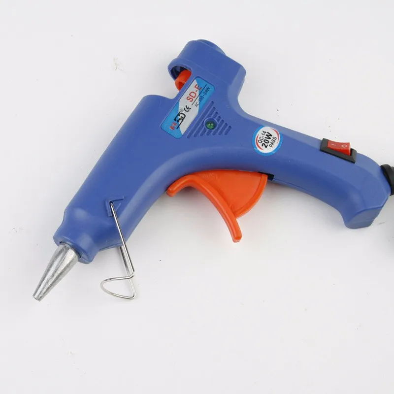 Электрический клеевой пистолет с диаметром стержня 8 мм. Потребляемая мощность 20Вт. Простая конструкция термопистолета удобно лежит в руке, дополнительно инструмент оснащен выключателем.