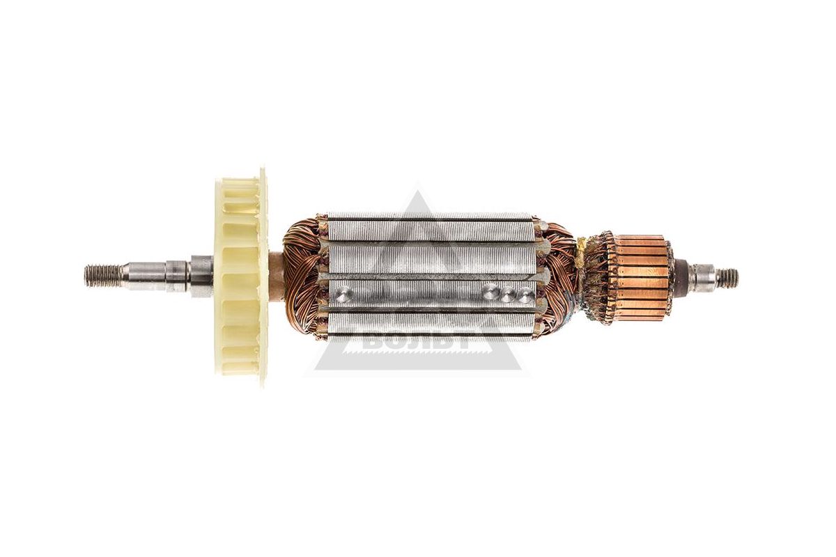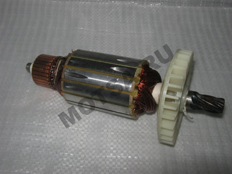 Якорь двигателя болгарки представляет собой токопроводящую обмотку и магнитопровод, в который запрессован вал вращения. Он имеет на одном конце ведущую шестерню, на другом коллектор с ламелями. Магнитопровод состоит из пазов и мягких пластин, покрытых лаком для изоляции друг от друга.