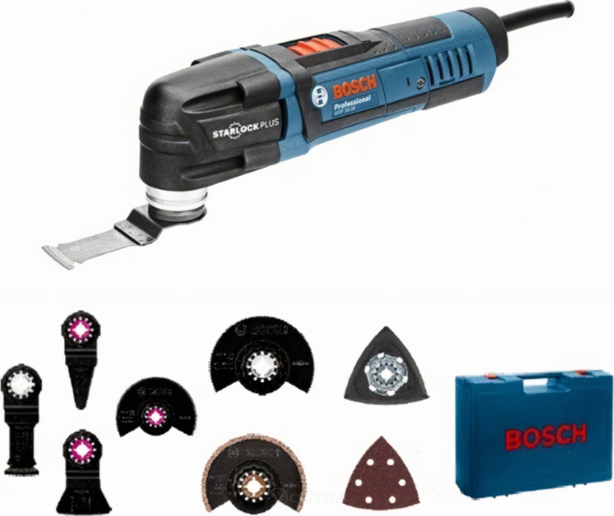 Компания Bosch выпускает реноватор GOP 30-28, который внешне копирует “старшую” вышеописанную модель, но оснащен мотором с меньшей мощностью на 300 Вт. Несмотря на это, патрон МФИ способен совершать до 20000 кол/мин, не уступая лидеру обзора. Но пользователи в отзывах сообщают, что при продолжительных работах придется делать более частые остановки для остывания двигателя — примерно каждые 15 минут. Весит реноватор 1.5 кг, а высота передней части корпуса составляет 75 мм, поэтому им удобно подлазить в узкие места. Поставляется инструмент с насадками в пластиковом кейсе. К нему прилагается отрезной нож, два режущих диска, две торцевые пилы и шабер.